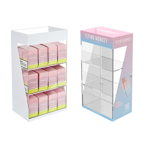Apex 3 Tiers Acrylic Pouch Hiển Thị Giá Countertop Khói Cửa Hàng Hiển Thị Trường Hợp Với Moveable Bảng Điều Khiển Phía Trước