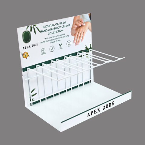 Apex ชั้นวางโชว์ผลิตภัณฑ์ดูแลผิวโลหะแบบถอดได้ชั้นวางครีมทามือสำหรับร้านเสริมความงาม